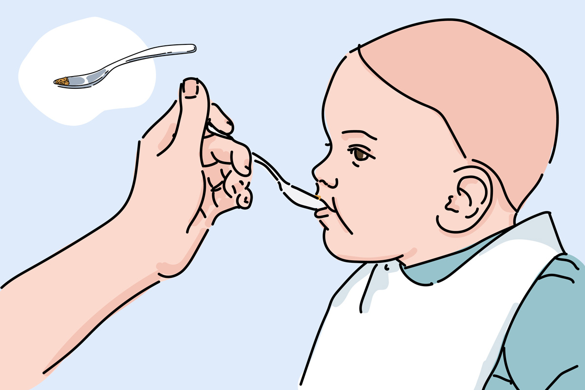 For example, mix a small amount (about a quarter of a teaspoon) of hard-boiled egg or peanut butter or paste into your baby’s usual food, such as vegetable puree.